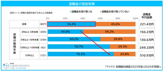 退職金制度を取り入れている企業は、勤続年数3年以上から退職金支給している企業が多い。前職で3年以上勤務した転職者のうち、退職金を受け取った割合は54.4%となり、約半数は退職金を受け取っていないことがわかった。退職金の平均金額は221.4万円で、勤務年数に比例して平均金額は高い傾向にある。【図6】