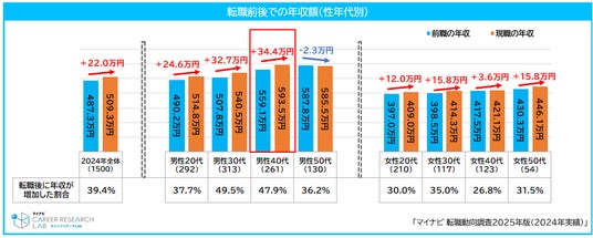 転職後に年収が上がったと回答した割合は39.4%で、特に30代男性(49.5%)、40代男性(47.9%)の増加割合が高かった。また、転職後の平均年収は509.3万円で、転職前の平均年収487.3万円よりも22.0万円高く、50代男性を除くすべての性年代で転職前よりも平均年収が増加している。転職によって一番年収が上がったのは40代男性で増加額は34.4万円、次いで30代男性で32.7万円となった。【図4】