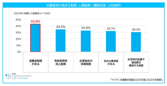 2024年に転職した人に、応募意欲が上がる施策・制度を調査したところ、「退職金制度がある」が42.8%で最多となった。【図5】