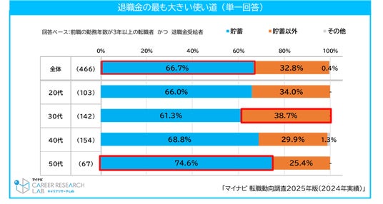 また、退職金の最も大きい使い道としては「貯蓄」が66.7%となり、年代別では50代の「貯蓄」割合が74.6%で最も高い結果となった。退職金制度がある企業に魅力を感じ、退職金を貯蓄に回す割合が高いことから、将来に備えて経済的な安心材料を求めているのではないかと考えられる。【図7】