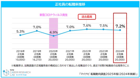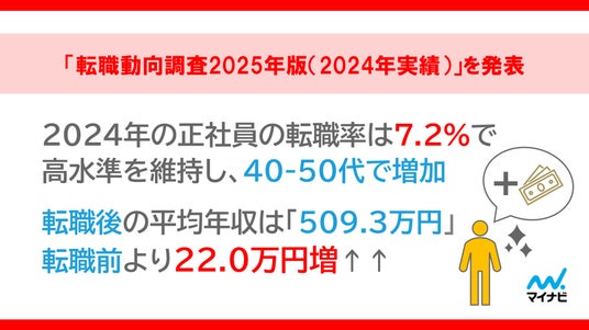 株式会社マイナビ(本社:東京都千代田区、代表取締役 社長執行役員:土屋芳明)は、現在正社員として働いており、2024年に転職した20代~50代の男女1,500名を対象に、転職者の傾向や変化を調査した『転職動向調査2025年版』を発表した。