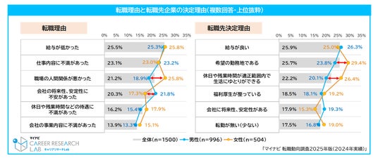 2024年に転職した人に転職理由を聞くと、「給与が低かった(25.5%)」が最も多い結果となった。 転職先の決定理由でも、「給与が良い(25.9%)」が全体と男性で最多だった。一方女性は「希望の勤務地である(29.4%)」が最多となり、転職先の決定理由には男女差がみられた。【図3】