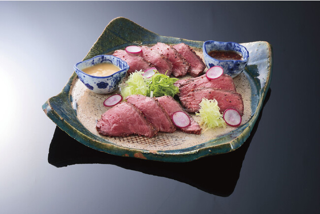 黒毛和牛のもも肉の中で比較的柔らかく脂身の少ない赤身肉を使用。赤身のうまみを引き出すため低温調理製法でしっとりジューシーに仕上げました。焼き舞茸の香ばしさを加えた「玉葱ソース」、バターや辛子、コーンでコクを加えた「白味噌ソース」。自社店舗内で製造したこだわりのソースで楽しむローストビーフです。