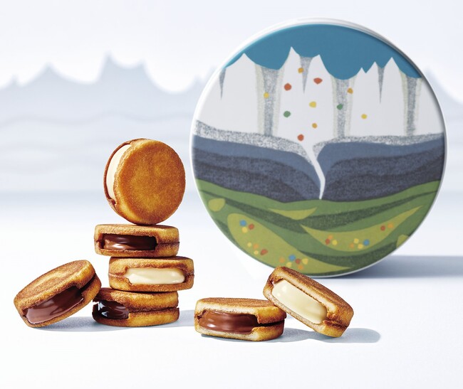 北海道発・冬季限定ブランド〈SNOWS(スノー)〉。代名詞の「スノーサンド」は、冬ならではの濃厚で風味豊かな放牧牛乳のおいしさが際立つ生チョコレートを、北海道産素材を使ったラングドシャクッキーで挟みました。生チョコのなめらかさとラングドシャクッキーのカリカリ感による食感のコントラストも魅力。山の版画家・大谷一良氏の作品を配したパッケージもギフトにぴったり。