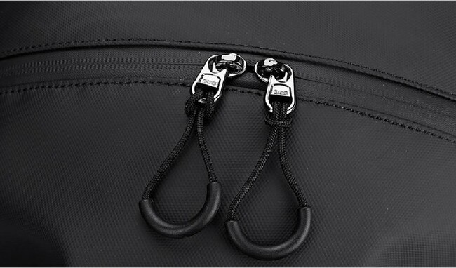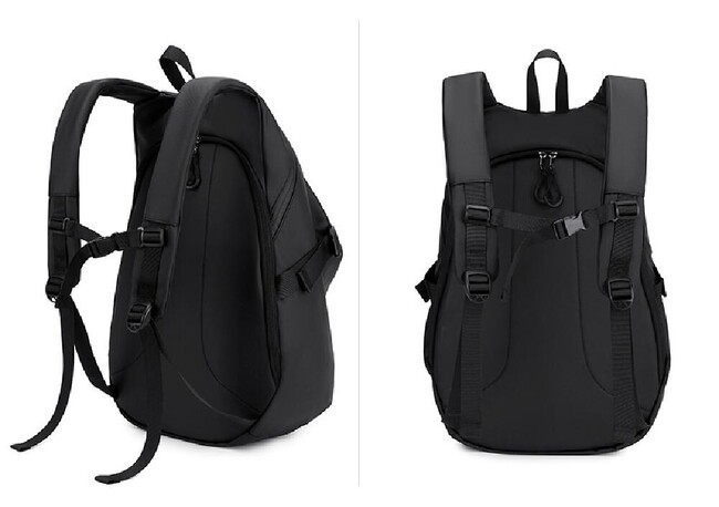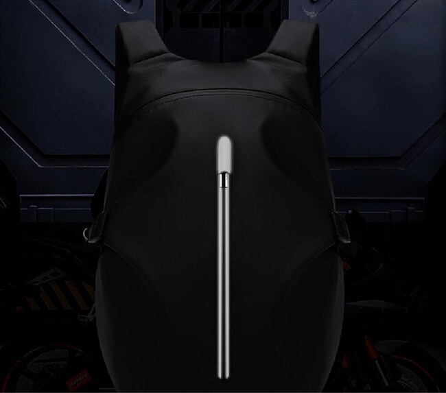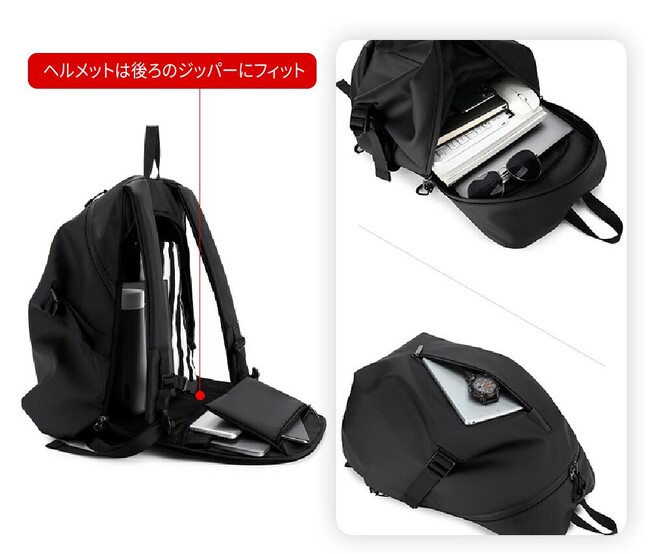 バッグの中にはパソコンやiPadが収納できる2層式のポケットがあります。ヘルメットバッグの右側には、鍵、イヤホン、水筒などのアイテムを収納できます。背面には取り出しやすいジッパーポケットがあり、財布やスマートフォンなどを収納できます。