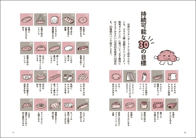 SDGsの持続可能な開発目標のように、包括的性教育の30項目を30種類のパンで紹介。