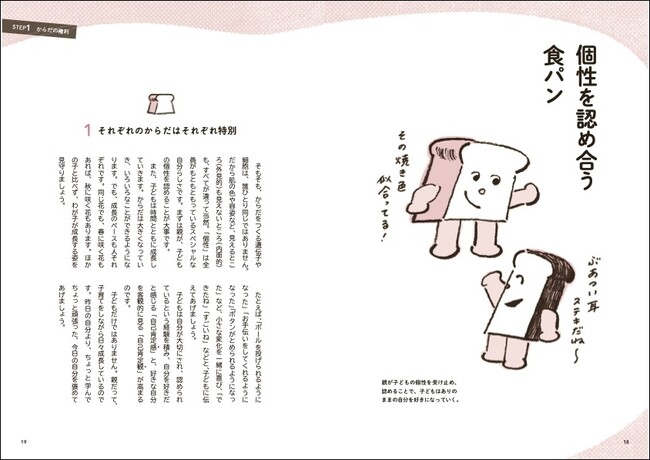 焼き色やミミの厚さが違う、それぞれの個性をもった食パンのイラストとともに、親が日常のなかで子どもの個性を受け止め認めることの大切さを解説。