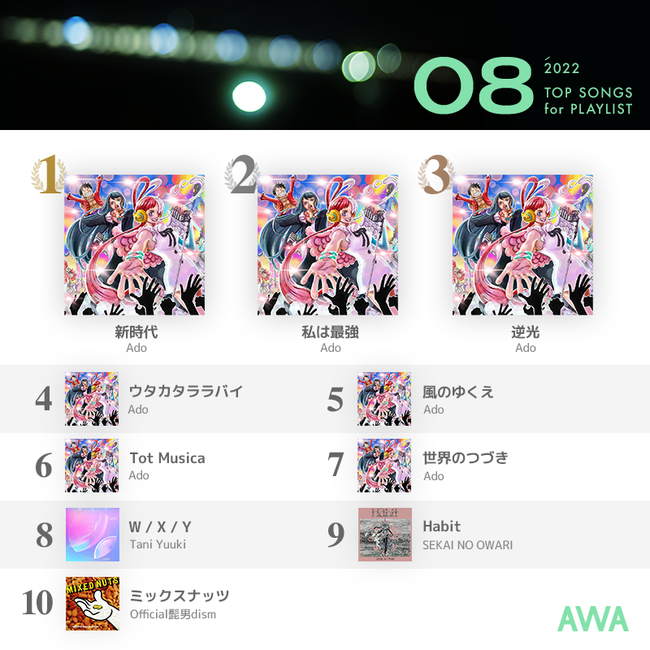 ~2022年8月度のAWAプレイリスト採用楽曲ランキングを発表~