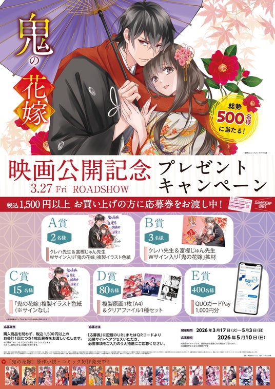 スターツ出版株式会社(本社:東京都中央区、代表取締役社長:菊地修一)は、『鬼の花嫁』の実写映画公開およびアニメ化を記念して、株式会社トーハン(本社:東京都新宿区、代表取締役社長:川上浩明)とともに、3月17日(火)より全国592の書店にて「キャラクターペーパースタンド」をプレゼントする限定フェアと、店頭およびSNSでのプレゼントキャンペーンを開始致しました。