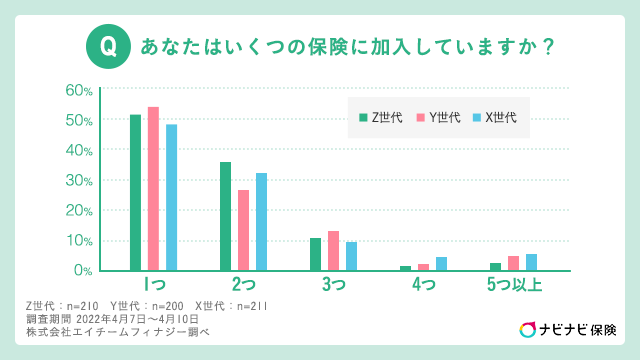 現在、生命保険に加入している人に加入している生命保険の数について質問したところ、すべての世代で「1つ」という回答が最多であり、次いで「2つ」という回答が多いという結果になりました。