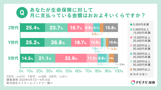 現在、生命保険に加入している人に、生命保険に対して月に支払っている金額を質問したところ、Z世代では、「5,000円未満」と回答した人が25.4%で最多でした。