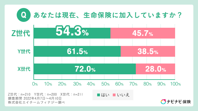 世代別に見ると、Z世代で54.3%、Y世代で61.5%、X世代では72.0%もの人が加入しており、年代があがるほど生命保険に加入している人が顕著に増えていることが見て取れます。