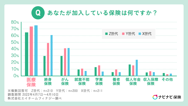 現在、生命保険に加入している人に加入している保険について質問したところ、すべての世代で1位は医療保険、2位は終身保険、3位はがん保険(Z世代では2位と3位は同数)でした。
