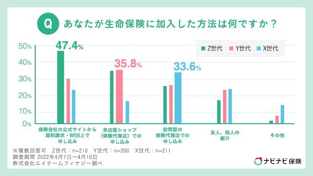 生命保険加入方法は、Z世代はインターネット、Y世代は店舗で、X世代は訪問販売で