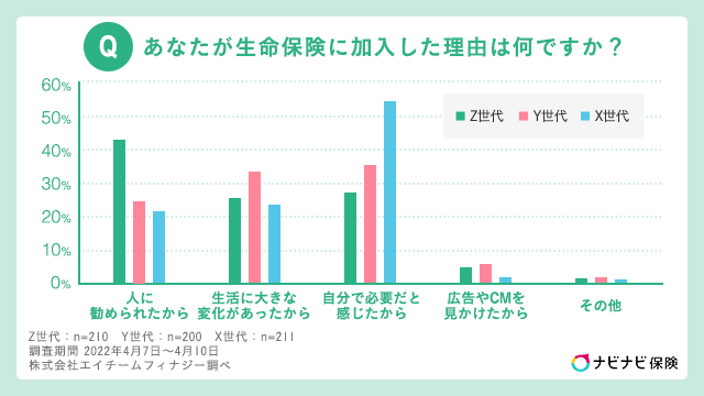 現在、生命保険に加入している人に、加入した理由を質問したところ、Z世代では「人に勧められたから」という理由が42.1%と最多になりました。