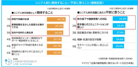 ◆法改正にむけて進むシニア雇用環境の整備。シニア人材への期待は「技術や知識の継承」、課題は「健康管理への対応」