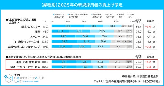 業種別では「環境・エネルギー(86.7%)」「金融・保険・コンサルティング(72.0%)」「流通・小売・サービス(68.9%)」「運輸・交通・物流・倉庫(70.9%)」で「上げる予定」が前年より増加した。【図4】