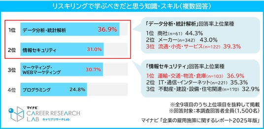 また、従業員にとって必要だと思うリスキリング内容を聞いたところ、「データ分析・統計解析(36.9%)」「情報セキュリティ(31.0%)」が上位となった。これらは従業員研修費を上げる予定が前年より増えた、「流通・小売・サービス(39.3%)」「運輸・交通・物流・倉庫(36.9%)」において特に多く回答されている。
