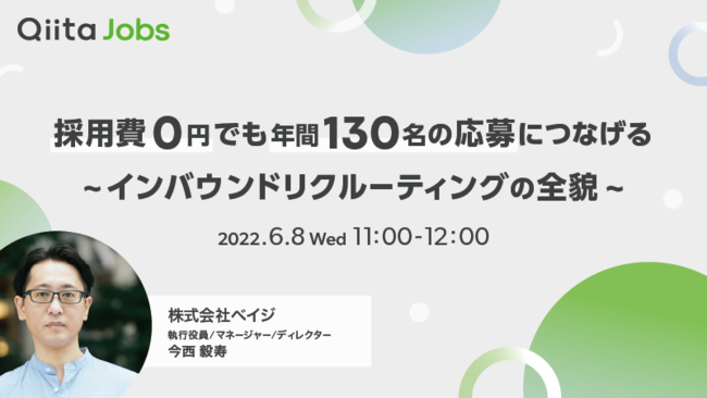 株式会社エイチームのグループ会社であるQiita株式会社(本社:名古屋市中村区、代表取締役社長:柴田健介)は、無料オンラインセミナー「採用費0円でも年間130名の応募に繋げる~インバウンドリクルーティングの全貌~」を2022年6月8日(水)に開催します。