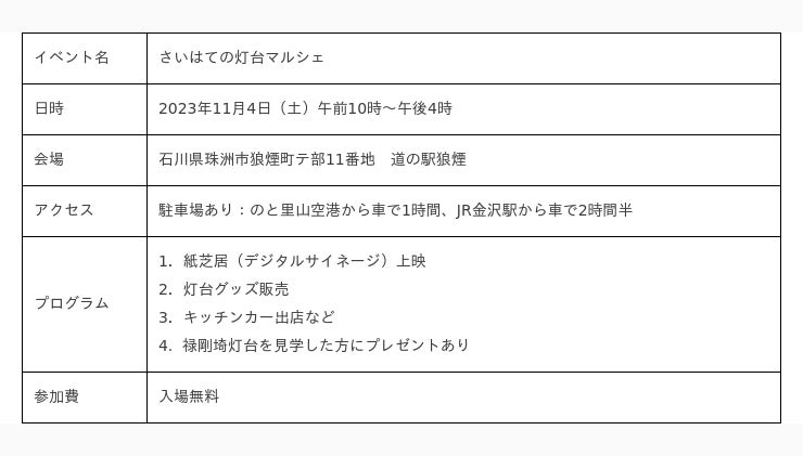 一般社団法人石川海洋環境研究所は、石川県珠洲市の「道の駅狼煙」(株式会社のろし)と連携して、2023年11月4日(土)に「さいはての灯台マルシェ」を初開催します。このイベントは日本財団「海と日本プロジェクト」の一環として、灯台を中心に地域の海の記憶を掘り起こし、地域と地域、異分野と異業種、日本と世界を繋ぎ、新たな海洋体験を創造する「海と灯台プロジェクト」の協力により実施します。