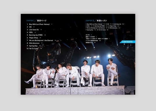 〈Boy With Luv (Feat. Halsey)〉〈ON〉〈IDOL〉〈Burning Up(FIRE)〉〈Spring Day〉の5曲について、BTSが所属するBIGHIT MUSICから提供を受けた公式日本語訳を本書で初めて公開します(『BTS LYRICS INSIDE』ではJapanese ver.の歌詞を掲載)。またBTSの歌詞世界を深く学べる特製「暗記シート」を封入しています。