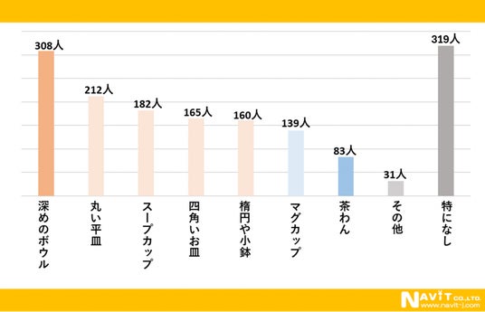 今後どのような形の「白いお皿」があればほしいですか?という質問を複数回答可で行ったところ、「深めのボウル」が308人、「丸い平皿」が212人、「スープカップ」が182人と続きました。深めのボウルが人気のようです。