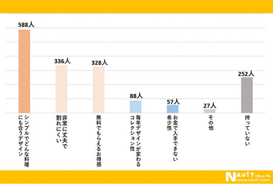「白いお皿」の魅力はどこにあると思いますか?という質問を複数回答可で行ったところ、「シンプルでどんな料理にも合うデザイン」が588人、「非常に丈夫で割れにくい」が336人、「無料でもらえるお得感」が328人と続きました。白くてシンプルなお皿はどんな料理にも合うので重宝しますよね。