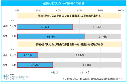 また、「服装・身だしなみが自由である職場は、応募意欲が上がる」とした割合は、アルバイト就業者全体が53.6%に対し学生は65.4%、「服装・身だしなみが理由で応募を辞退した経験がある」とした割合は、アルバイト就業者全体が20.1%に対し学生は34.2%だった。