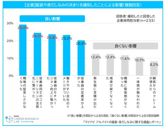 ◆直近5年間で従業員の服装・身だしなみの決まりを緩和した企業は3割以上。良い影響は、「職場の堅苦しさがなくなった」が29.2%で最多
