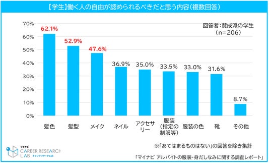 ◆学生の3人に2人がアルバイト就業時の「服装・身だしなみの自由」に賛成。賛成理由は「自分らしく働きたい」が最上位。自由が認められるべき内容は「髪色」「髪型」「メイク」など