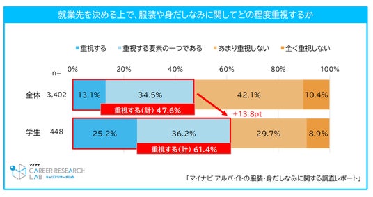 アルバイト就業者に、就業先を決める上で服装・身だしなみ規定をどの程度重視するか聞いたところ、重視する(重視する+重視する要素の一つ)が47.6%だった。アルバイトをしている学生に限定すると、「重視する」が61.4%で、全体より10pt以上高かった。