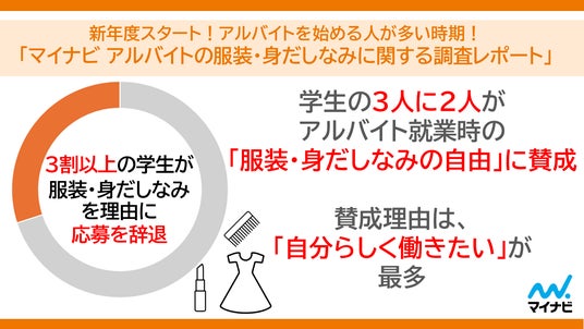 新年度でアルバイトを始める人が多い時期!学生の3人に2人がアルバイト就業時の「服装・身だしなみの自由」に賛成。理由は、「自分らしく働きたい」が最多。3割以上の学生が服装・身だしなみを理由に応募辞退