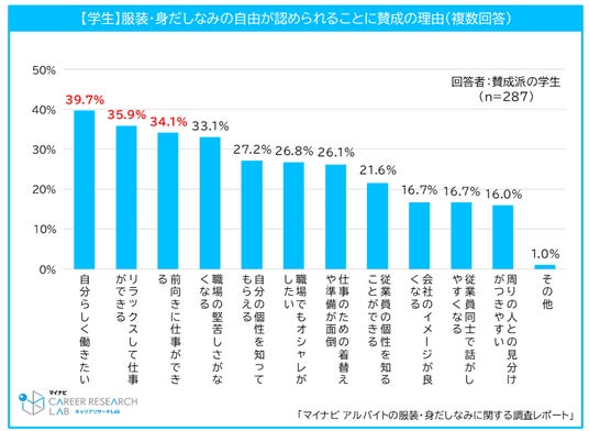 学生の賛成理由は「自分らしく働きたい」が39.7%で最も多く、「リラックスして仕事ができる(35.9%)」「前向きに仕事ができる(34.1%)」と続いた。