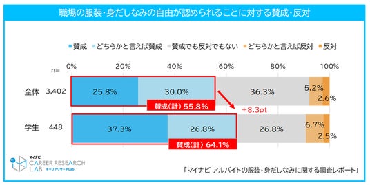 アルバイト就業者に、「職場の服装や身だしなみの自由が認められること」の賛否について聞いたところ、賛成が55.8%となった。アルバイトをしている学生(高校生・大学生等)に限定すると、賛成が64.1%で全体より8.3pt高く、服装・身だしなみの自由への関心の高さがうかがえる。