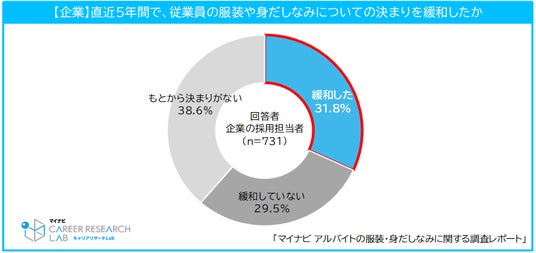 企業のアルバイト採用担当者に、直近5年間(2020年~2025年)で従業員の服装・身だしなみの決まりを緩和したか聞いたところ、緩和した割合は31.8%だった。