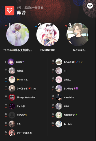 2022年8月度のラジオ配信ラウンジランキングで総合1位に輝いたのは、“何気ない日常に癒しを”テーマに音楽活動を行うtama喋る天然水。。。フラワーチャット部門、リアクション部門でも1位に輝き、7月から8月に渡り開催されたレベルアップキャンペーンでも見事入賞を果たしています。2位には、部門別3部門でトップ3圏内に入賞したEMUNEKOが獲得。3位は、フリートークに絶大な人気を誇るNosuke。がランクインしています。その他にも、iRu-Ma.、