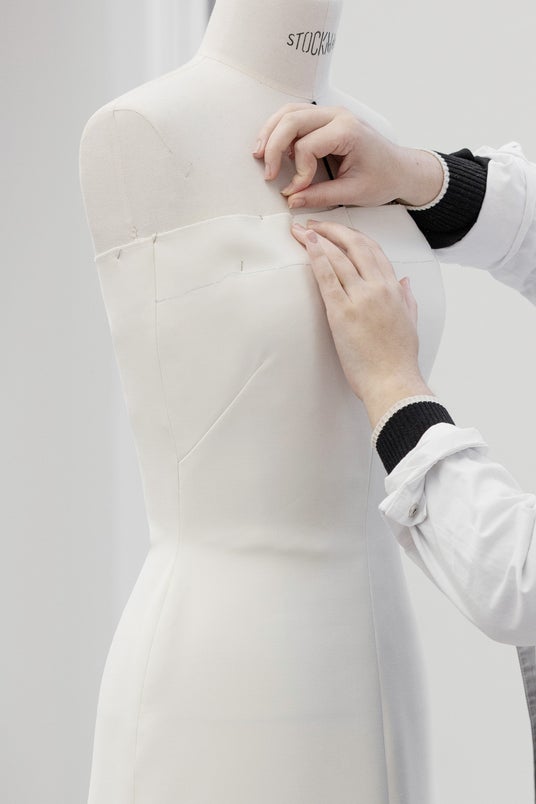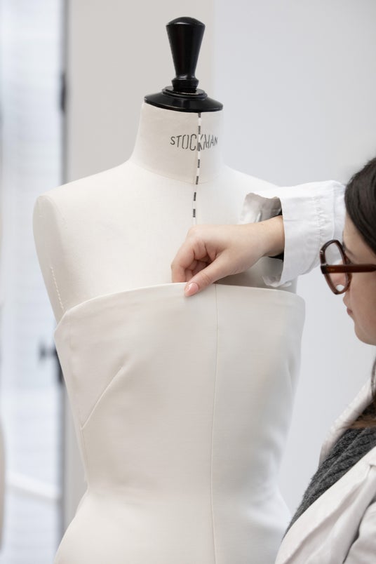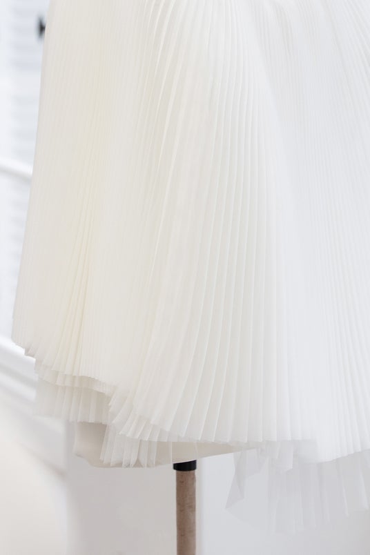 アニャ・テイラー=ジョイは、ホワイトウールとシルクのドレスに、ホワイトオーガンザのプリーツケープを纏いました。このドレスはメゾンのアトリエで550時間をかけて完成に導かれます。ディオールアトリエのエクセレンスを体現したサヴォワールフェールの詳細をソフィ・カルによる撮り下ろし写真からご覧ください。