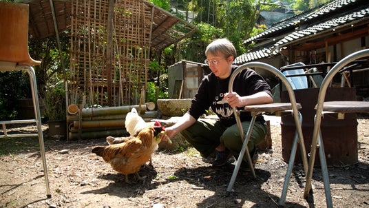 河南町に暮らすイギリス出身のケイティさんは、旦那さんと11羽の鶏と暮らす充実した生活を送る。