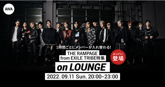 AWA株式会社(本社:東京都港区、代表取締役CEO:冨樫晃己)が運営する、サブスクリプション型(定額制)音楽ストリーミングサービス「AWA(アワ)」は、2022年9月11日(日)20:00~23:00の3時間に渡り、無料で誰でも参加できるオンライン空間「LOUNGE(ラウンジ)」で、THE RAMPAGE from EXILE TRIBEのメンバー登場イベントを開催いたします。