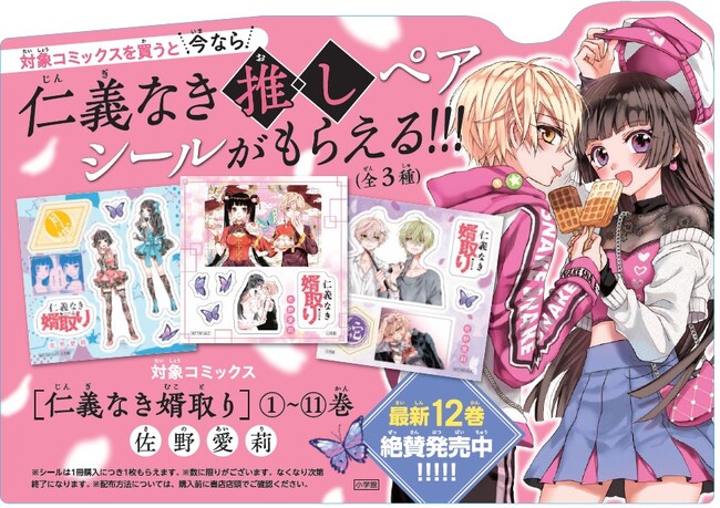 2023年4月26日(水)に、「Sho-Comi」で大人気連載中の『仁義なき婿取り』(佐野愛莉)の最新第12.巻が発売! 新刊発売を記念して、読者から高い人気を得ている推しペア達の特製シール(全3種)がもらえるノベルティフェアが4月26日より全国のフェア参加書店にて順次スタートします! 読者人気の高いキャラクター2人組の特製シールなので、コンプリートしたくなること間違いなし! ぜひこの機会にゲットしてみてください!