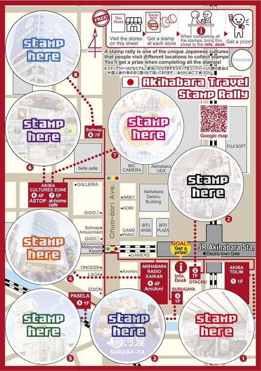 1.各店舗に設置されたスタンプラリー用台紙(兼秋葉原マップ)を使用し外国人旅行者に人気の8店舗を巡る。