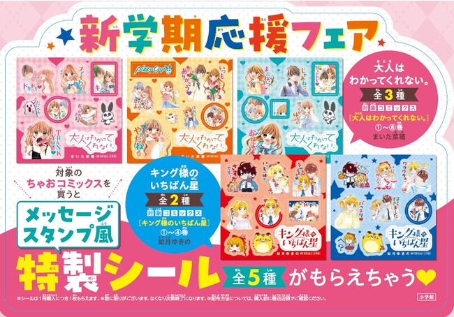 2023年4月26日(水)に大人気の『大人はわかってくれない。』(まいた菜穂)と『キング様のいちばん星』(如月ゆきの)の新刊コミックスが発売! それを記念して、全国のちゃおサポーターショップで対象コミックスを購入すると、メッセージスタンプ風特製シール(全5種)がもらえるノベルティフェアが4月26日より順次スタートします! メッセージ付きのシールだから、お気に入りのスケジュール帳に貼ってテンションを上げてみたり、新しくできたお友達への手紙に貼って想いを伝えたりできちゃいます! ぜひこの機会にゲットしてみてね!