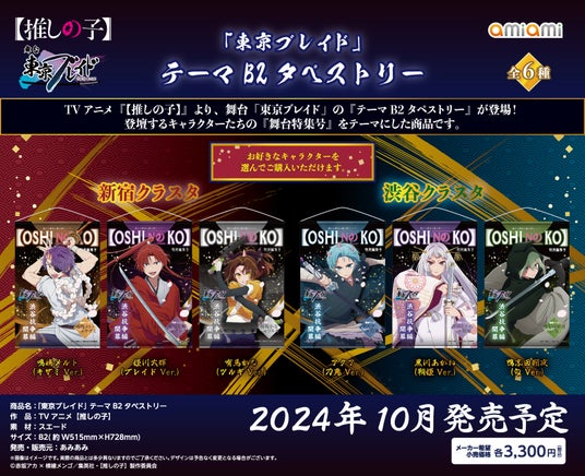 フィギュア&ホビー通販大手の「あみあみ」を運営する、大網株式会社(本社・東京都文京区)は、TVアニメ『【推しの子】』より、舞台 「東京ブレイド」の「鑑賞券風アクリルキーホルダー」「テーマB2タペストリー」「テーマアクリルキーホルダー」を、2024年10月予定で発売いたします。