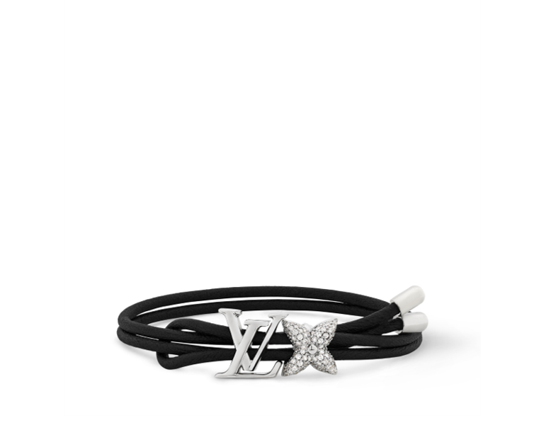 圧倒的なシグネチャーステートメントを放つ、上品なディテールと洗練されたデザインが魅力の「ブレスレット・LV ブルーミング ストラス」。ゴールド&シルバーカラーのメタルで精緻に模られ、きらめくジルコンで彩られたモノグラム・フラワーとLV イニシャルなど、メゾンのさまざまなアイコンを細身のレザーコードに取付けました。あらゆる装いにフェミニンなエレガンスを印象的に演出する一品。