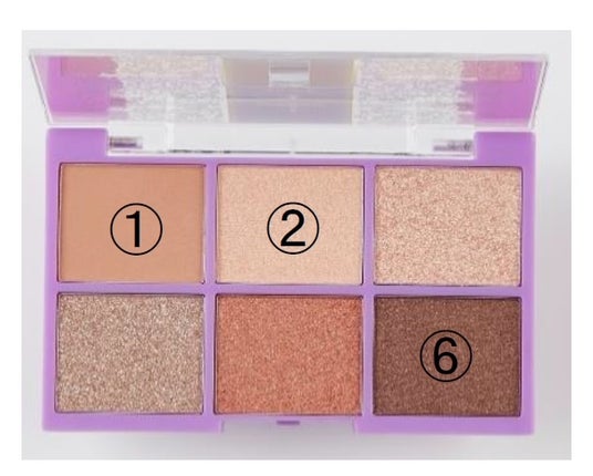 上まぶたには指で1.をアイホールより広めにのせ、下まぶたは2.と6.をMIXして目尻側2/3に。