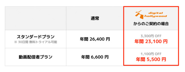 デジタルハリウッドの紹介URLからご契約いただくことで、通常料金 年間26,400円(税込)から 3,300円(税込)分の割引となります。