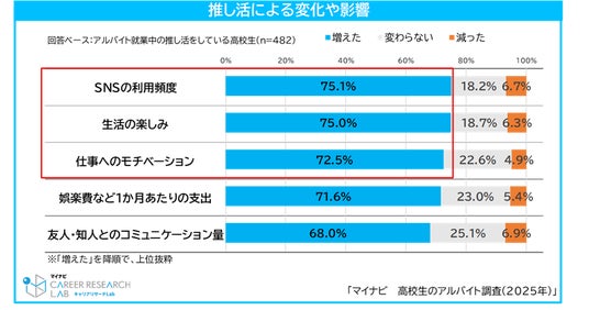 また、「推し活」による生活の変化で増えたことを聞くと、「SNSの利用頻度」が75.1%で最も高く、「生活の楽しみ(75.0%)」、「仕事へのモチベーション(72.5%)」が続いた。
