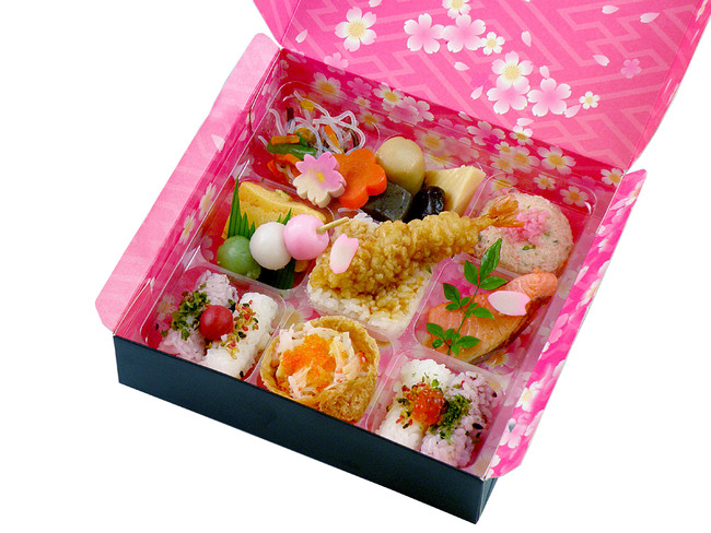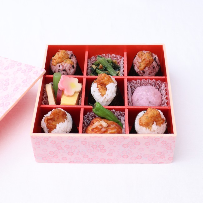 天むす、黒米天むすに筍や桜餅など春らしい食材を詰合せたお弁当。升目に別れた桜色の折箱でお花見にも最適な一品です。