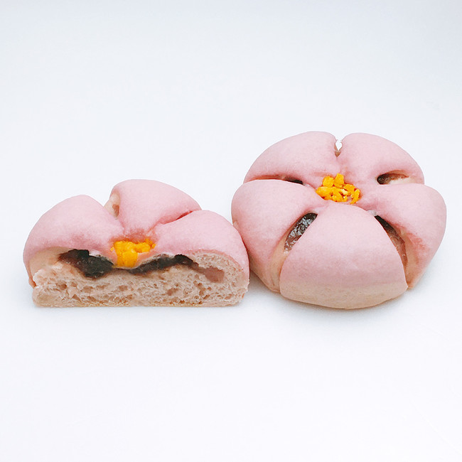 しっとりとしたパン生地で自社焚きの「つぶあん」と「桜餅風のフィリング」を包み、ピンク色のビスケット生地を乗せ桜の形を演出しました。