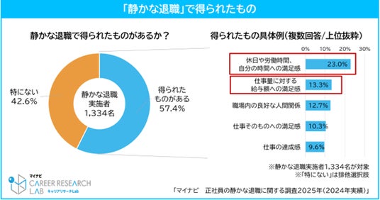 「静かな退職」をしている人に、「静かな退職」で得られたものがあるか聞くと、57.4%が「得られたものがある」と回答した。具体的には、「休日や労働時間、自分の時間への満足感(23.0%)」が最多で、「仕事量に対する給与額への満足感(13.3%)」で続いた。【図3】